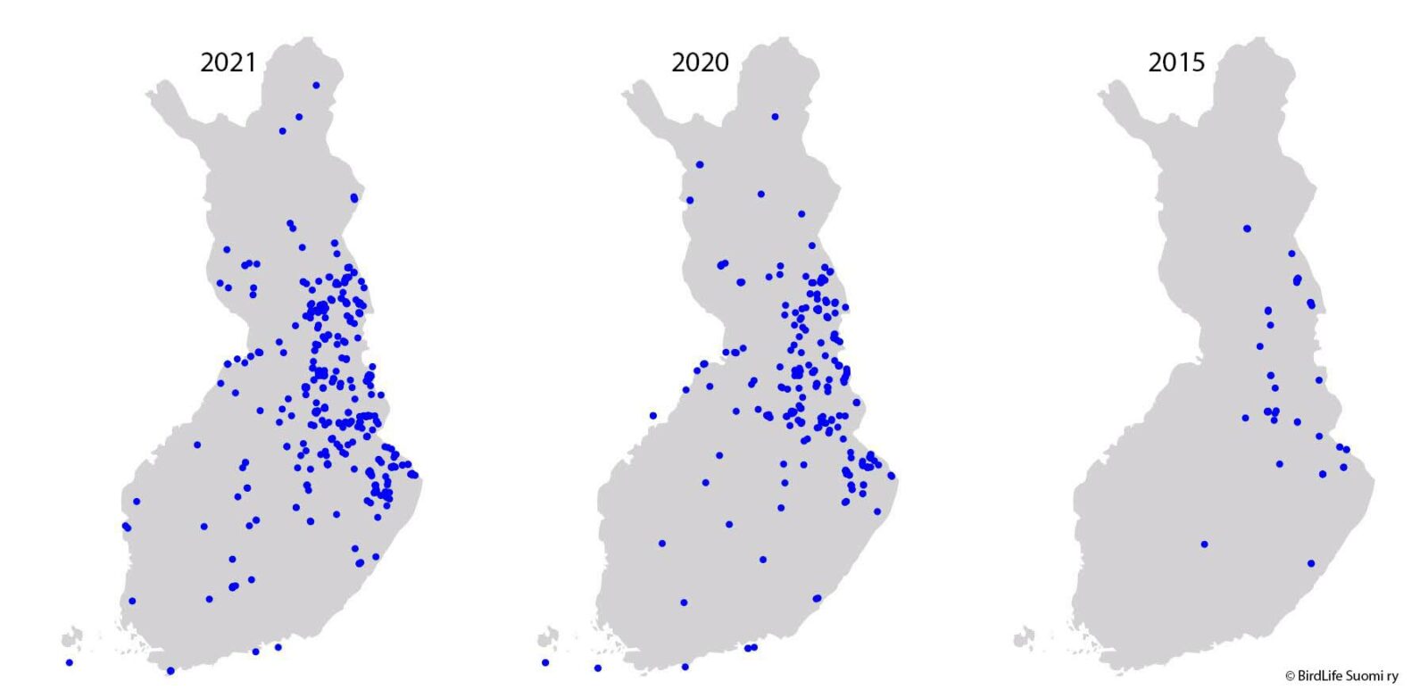 Tiiran sinipyrstöhavainnot 14.6. mennessä vuosilta 2021, 2020 ja 2015.