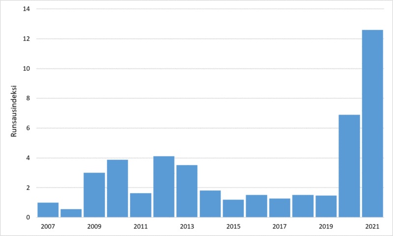 Sinipyrstöjen runsausindeksi (1.1.-14.6.) Suomessa vuosina 2007-2021. Indeksi on laskettu Tiiraan kirjattujen havaintojen perusteella tarkastelemalla runsautta 10×10 kilometrin ruuduissa.