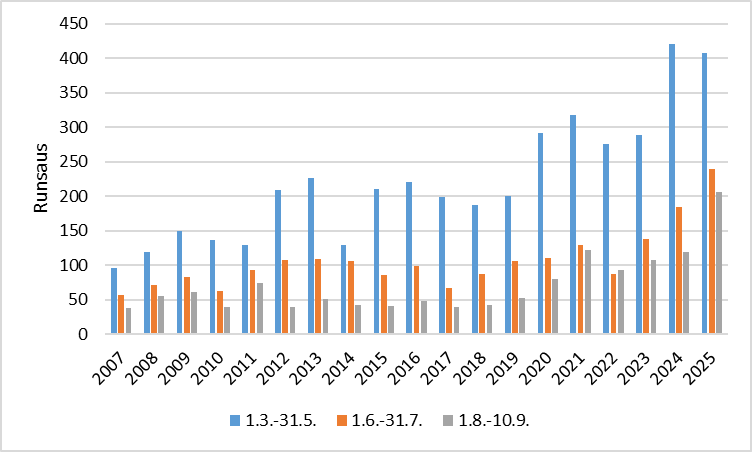 Haarahaukkahavainnot ovat lisääntyneet kaikkina vuodenaikoina, mutta erityisen suuri muutos on ollut loppukesän ja alkusyksyn havainnoissa. Vuoden 2025 huikein havainto on Joensuussa 31.8. muuttanut 12 linnun parvi, mutta myös esimerkiksi Helsingin Viikissä nähtiin 24.8. seitsemän eri yksilöä. Viime vuosikymmenen puolivälin tasoon verrattuna tämän vuoden haarahaukkamäärä jaksolla 1.8.10.9. on noin nelinkertainen!