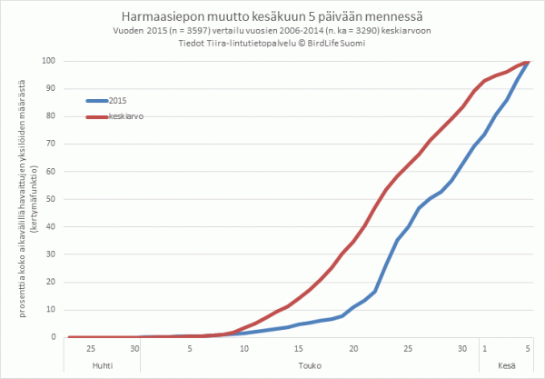 Lajien muuttoaikojen tarkemmasta ajoittumisesta kertovat aineistosta koostetut kuvaajat lintulajien esiintymisestä.