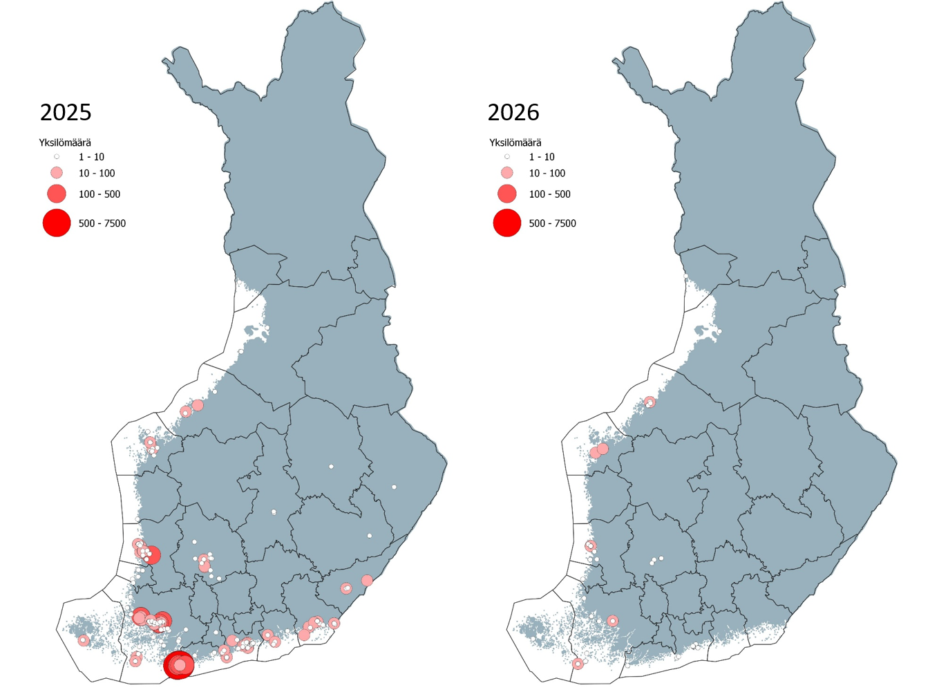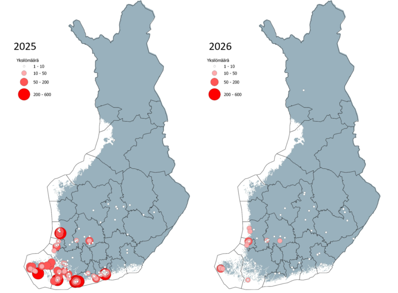 Harmaalokkihavainnot Suomessa 1.–10.2. vuosina 2025 ja 2026
