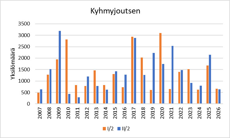 Kyhmyjoutsenen runsaus* 1.–10.2. ja 11.–20.2. vuosina 2007–2026