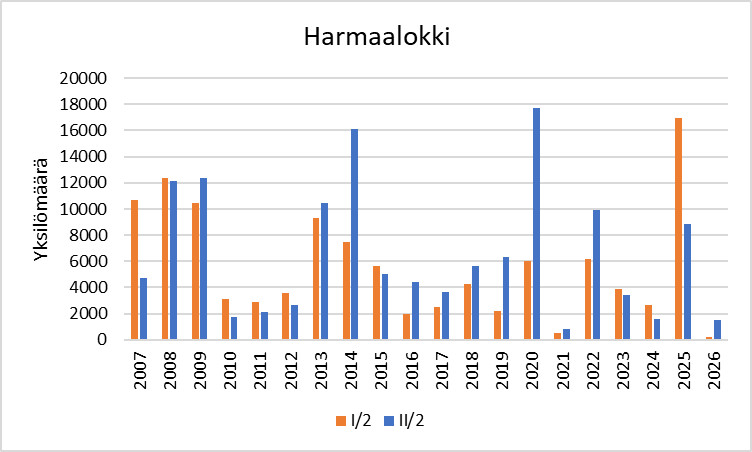Harmaalokin runsaus* 1.–10.2. ja 11.–20.2. vuosina 2007–2026