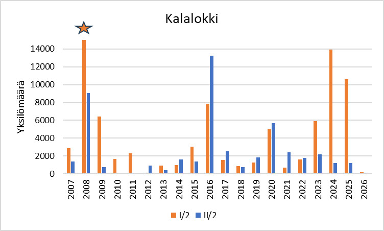 Kalalokin runsaus* 1.–10.2. ja 11.–20.2. vuosina 2007–2025. Vuonna 2008 lajia havaittiin ensimmäisellä jaksolla yli 40 000 yksilöä, mutta palkki on katkaistu kuvaajan selkeyttämiseksi.