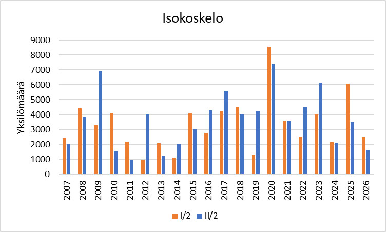 Isokoskelon runsaus* 1.–10.2. ja 11.–20.2. vuosina 2007–2026