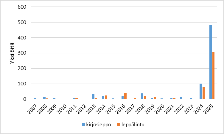 Tiira-lintutietopalveluun kirjatut kirjosieppo- ja leppälintuhavainnot jaksolla 1.–21.4. vuosina 2007–2025