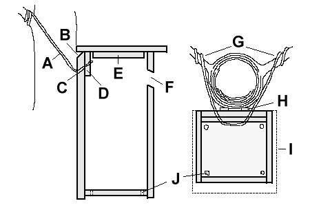 | A = Riittävän pitkä ripustuslanka, ettei puu kuristu B = Takaseinän yläreuna viistetty C = Kiinnitysreiät yläviistoon D = Kiinnitysreikien kohdalla vahvikelauta E = Sisäkannessa turpoamisvara F = Lentoaukko porattu yläviistoon G = Isossa puussa langanpäät solmitaan oksiin, ei aivan tyveen H = Pystylistat pitävät pöntön suorassa ja irti rungosta I = Katossa on räystäät myös sivuilla J = Pohjan kulmissa reiät kosteuden poistamiseksi |