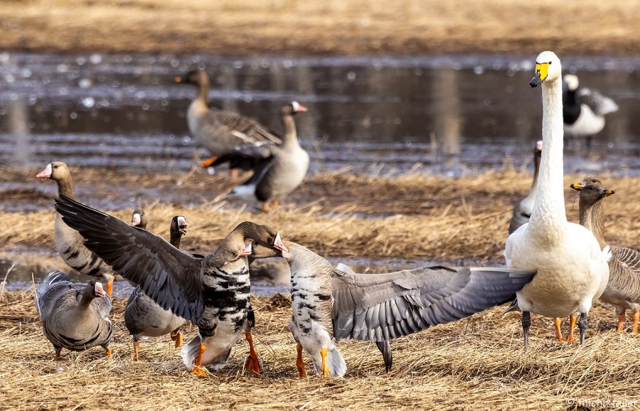 Tundra- ja metsähanhia sekä laulujoutsen ja valkoposkihanhi. Kuva: Micha Fager
