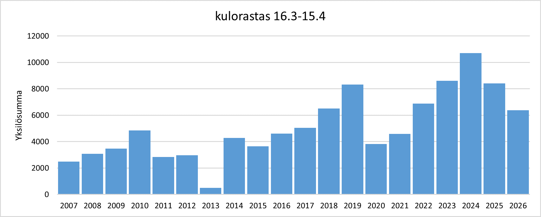 Kulorastaan yksilömäärien summa* jaksolla 16.3.–15.4. vuosina 2007–2026.