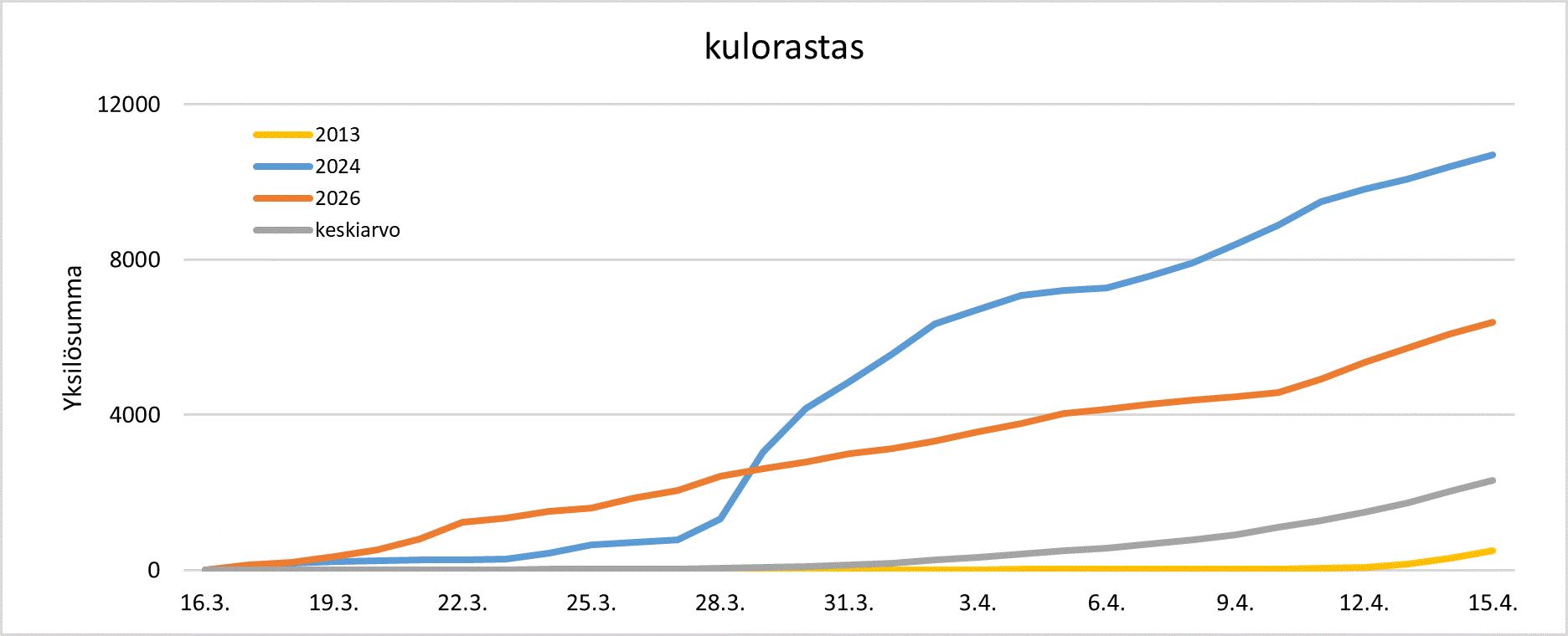 Kulorastaan muuton eteneminen 16.3.–15.4. vertailujakson myöhäisimpänä vuonna 2013 (keltainen), aikaisimpana vuonna 2024 (sininen), vuonna 2026 (oranssi) ja jaksolla 2007-2025 keskimäärin (harmaa).