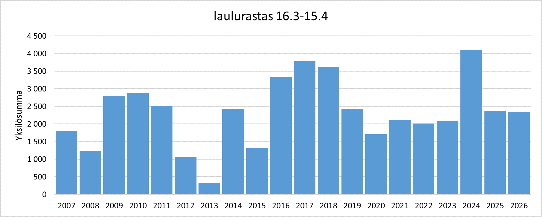 Laulurastaan yksilömäärien summa* jaksolla 16.3.–15.4. vuosina 2007–2026.