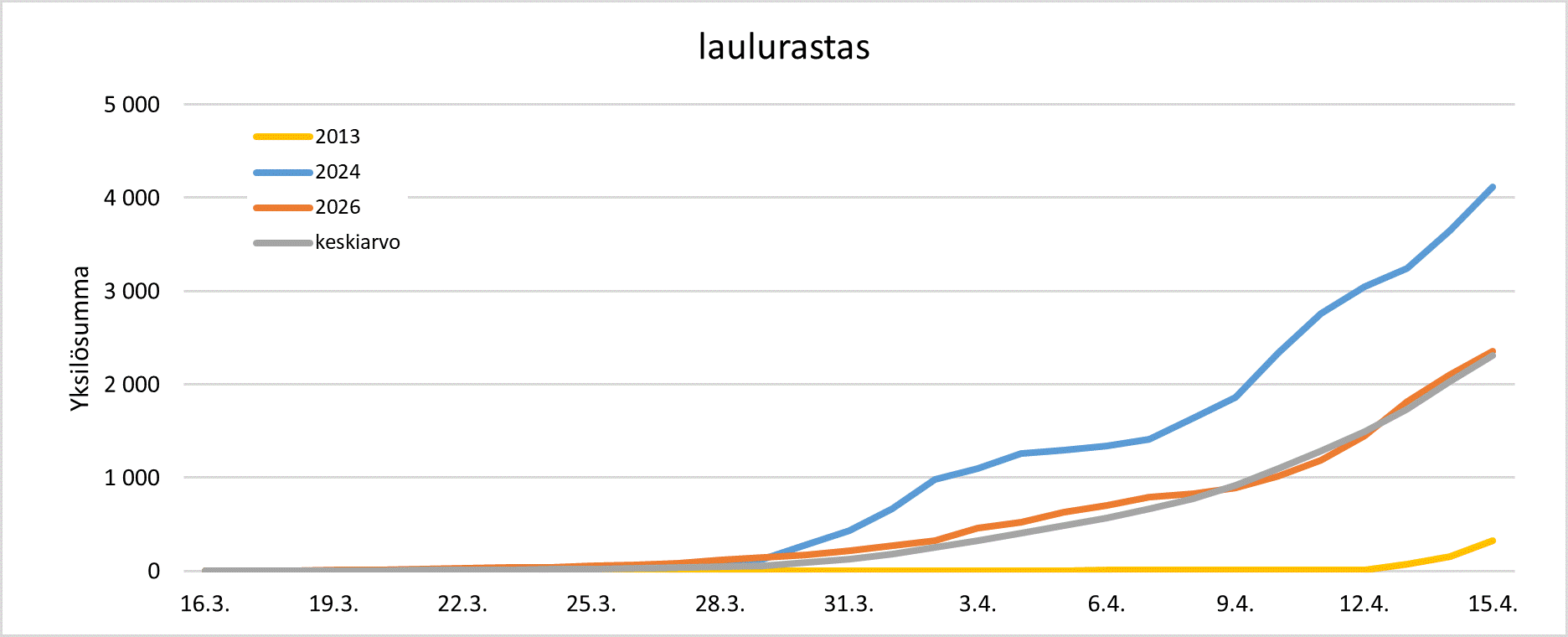 Laulurastaan muuton eteneminen 16.3.–15.4. vertailujakson myöhäisimpänä vuonna 2013 (keltainen), aikaisimpana vuonna 2024 (sininen), vuonna 2026 (oranssi) ja jaksolla 2007-2025 keskimäärin (harmaa).