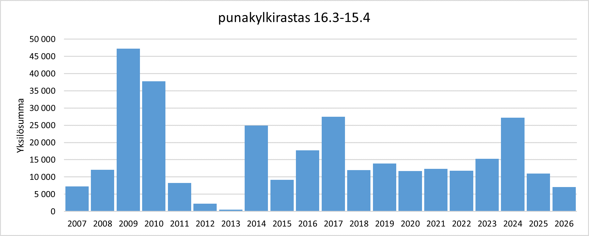 Punakylkirastaan yksilömäärien summa* jaksolla 16.3.–15.4. vuosina 2007–2026.