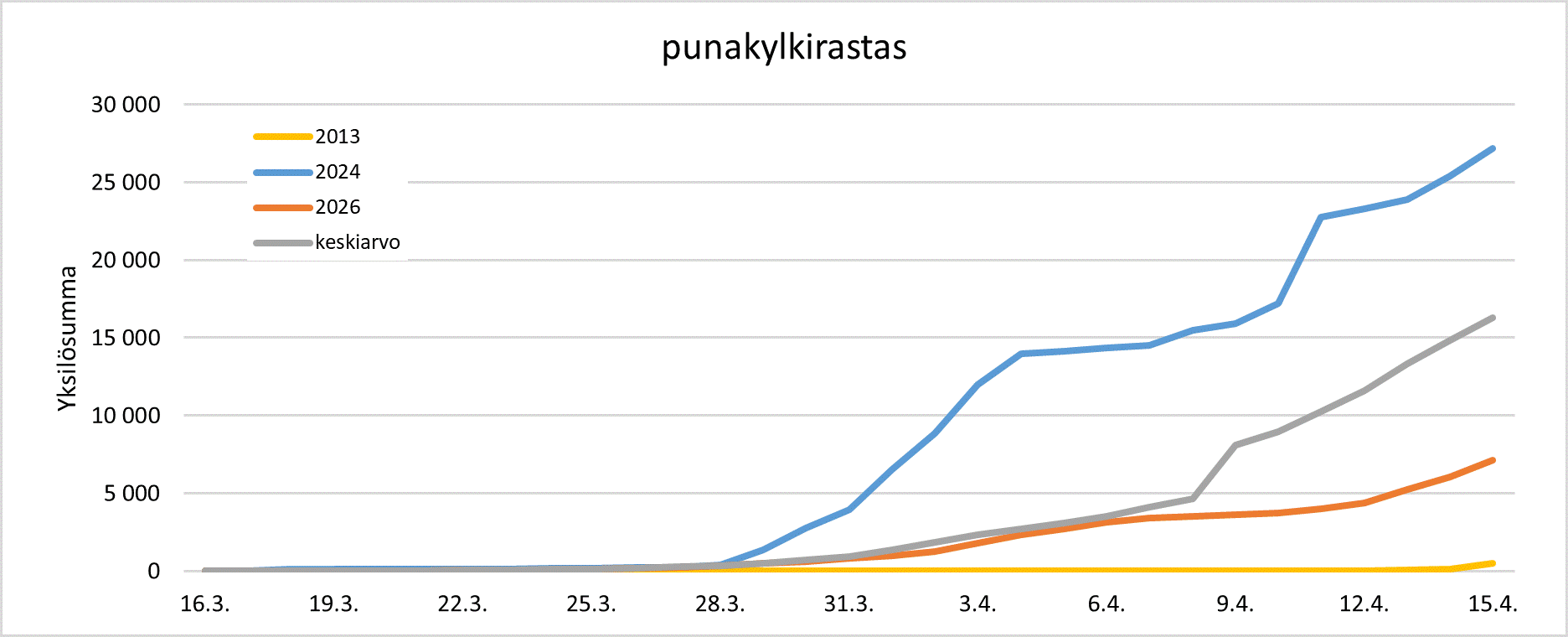Punakylkirastaan muuton eteneminen 16.3.–15.4. vertailujakson myöhäisimpänä vuonna 2013 (keltainen), aikaisimpana vuonna 2024 (sininen), vuonna 2026 (oranssi) ja jaksolla 2007-2025 keskimäärin (harmaa).