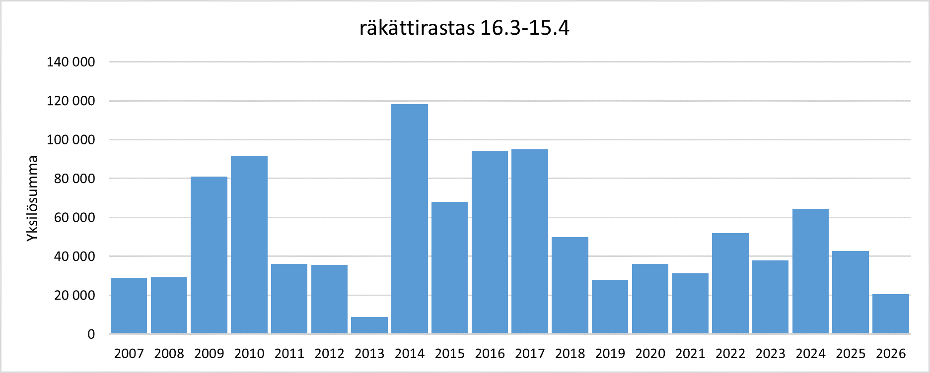 Räkättirastaan yksilömäärien summa* jaksolla 16.3.–15.4. vuosina 2007–2026.