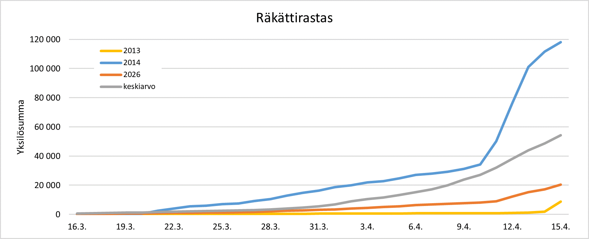 Räkättirastaan muuton eteneminen 16.3.–15.4. vertailujakson myöhäisimpänä vuonna 2013 (keltainen), aikaisimpana vuonna 2014 (sininen), vuonna 2026 (oranssi) ja jaksolla 2007–2025 keskimäärin (harmaa).