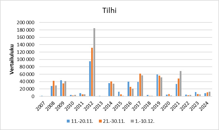Tilhen esiintyminen Suomessa vuosina 2007–2024 aikavälillä 11.11.–10.12. kolmanneskuukausittain.