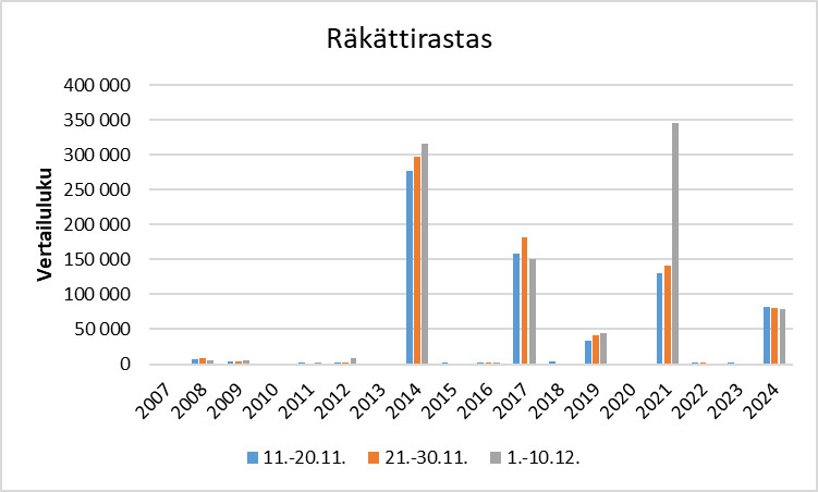 Räkättirastaan esiintyminen Suomessa vuosina 2007–2024 aikavälillä 11.11.–10.12. kolmanneskuukausittain.