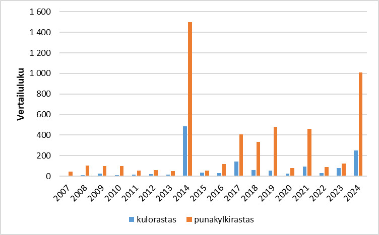Kulo- ja punakylkirastaan esiintyminen Suomessa vuosina 2007–2024 aikavälillä 11.11.–10.12.