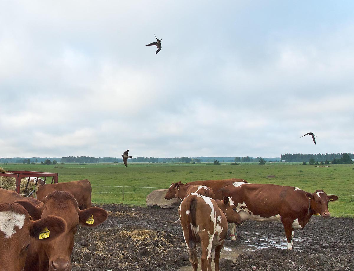 Haarapääskyjä saalistamassa kärpäsiä lehmihaassa. Kuva: Mauri Leivo.