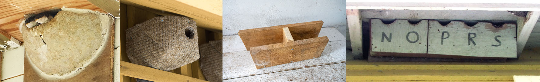 Räystäspääskyn tekopesiä (vasemmalta): puubetonipesä, huopapesä, puinen kaksio sekä puinen rivitalo. Kuvat: Raimo Henriksson, Mauri Leivo ja Juha Ylimaunu.