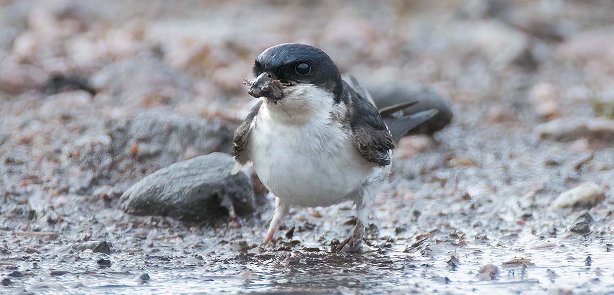 Räystäspääskyt hakevat mutaa kosteista painanteista pesänrakennustaan varten. Kuva: Mauri Leivo.