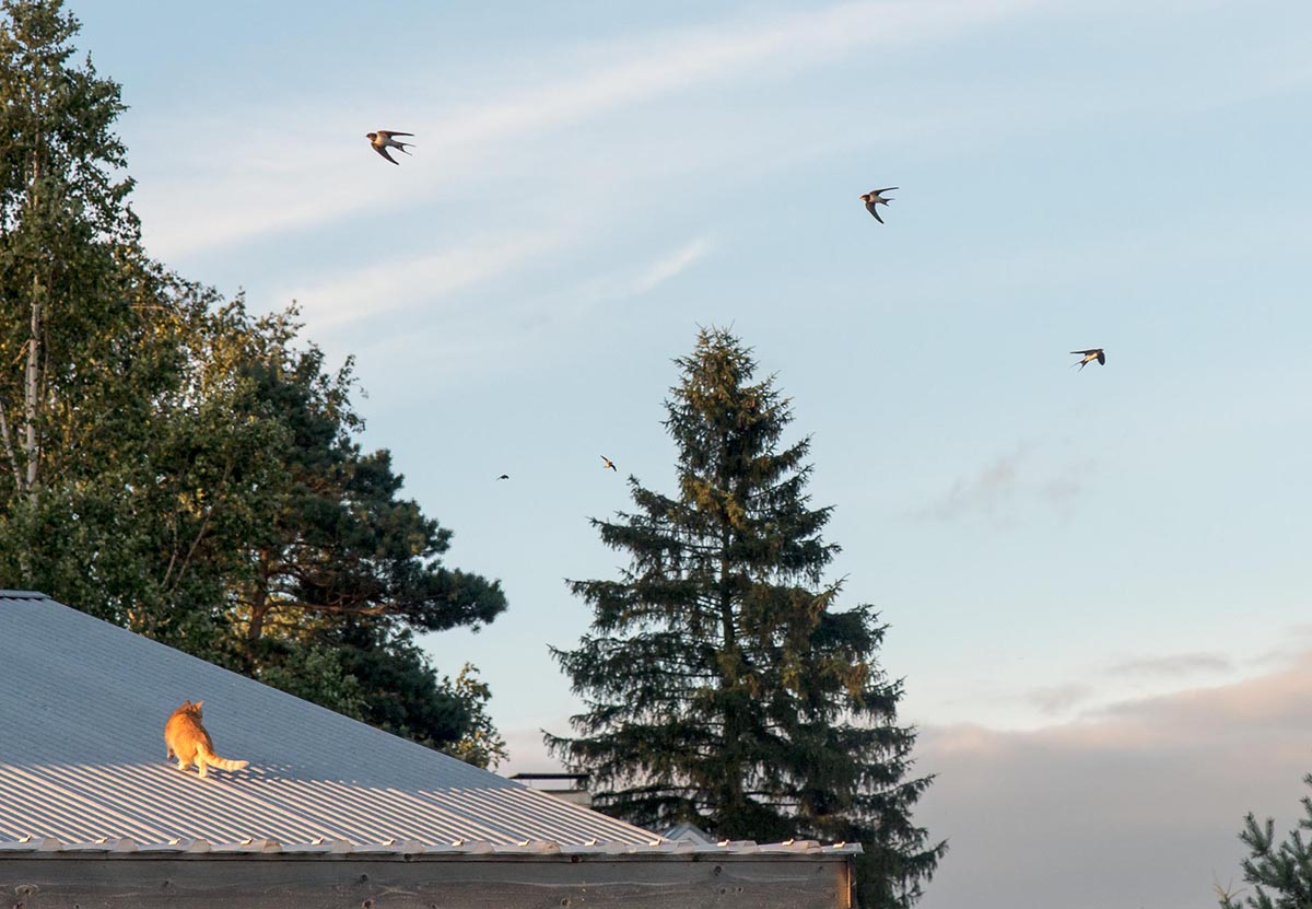 Kissa vaanimassa haarapääsky-yhdyskunnan luona. Kuva: Mauri Leivo.