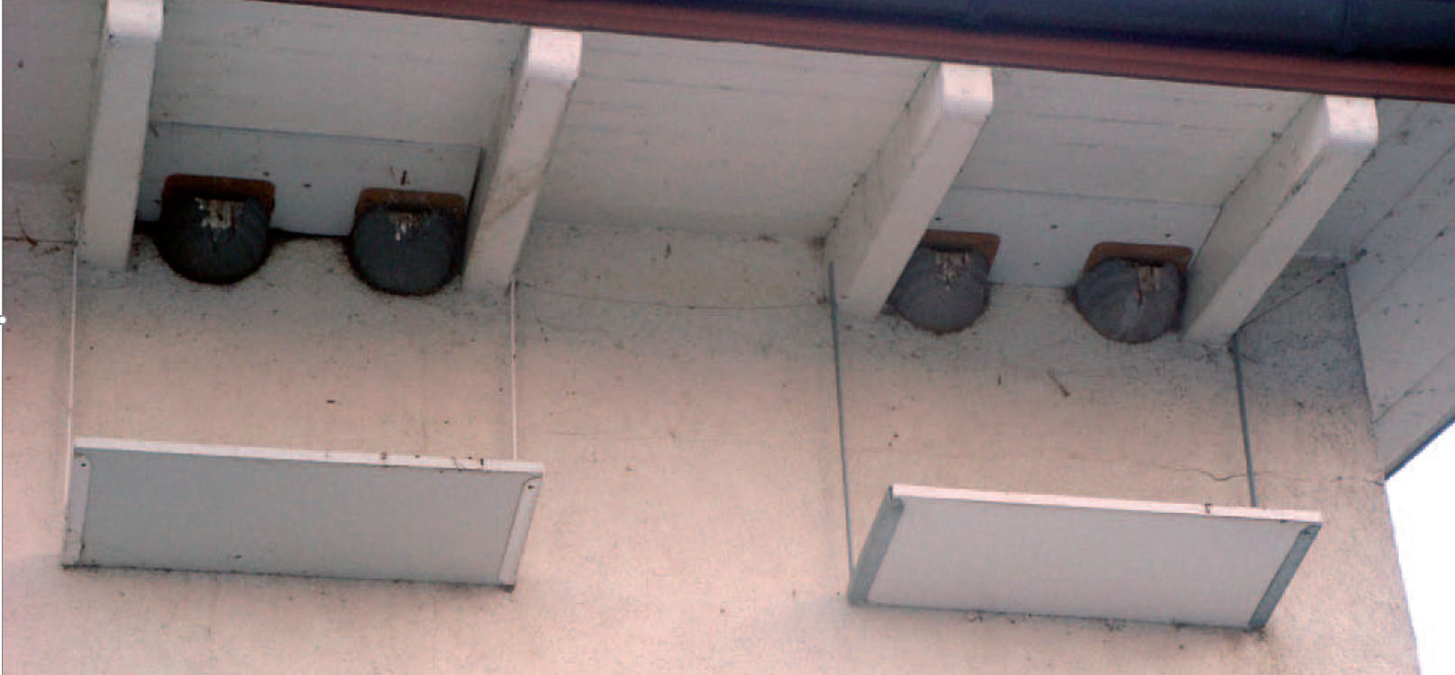 Pääskynpesien alle asennettuja, ulosvedettäviä ulostesuojalevyjä. Kuva; BirdLife Sveitsi.