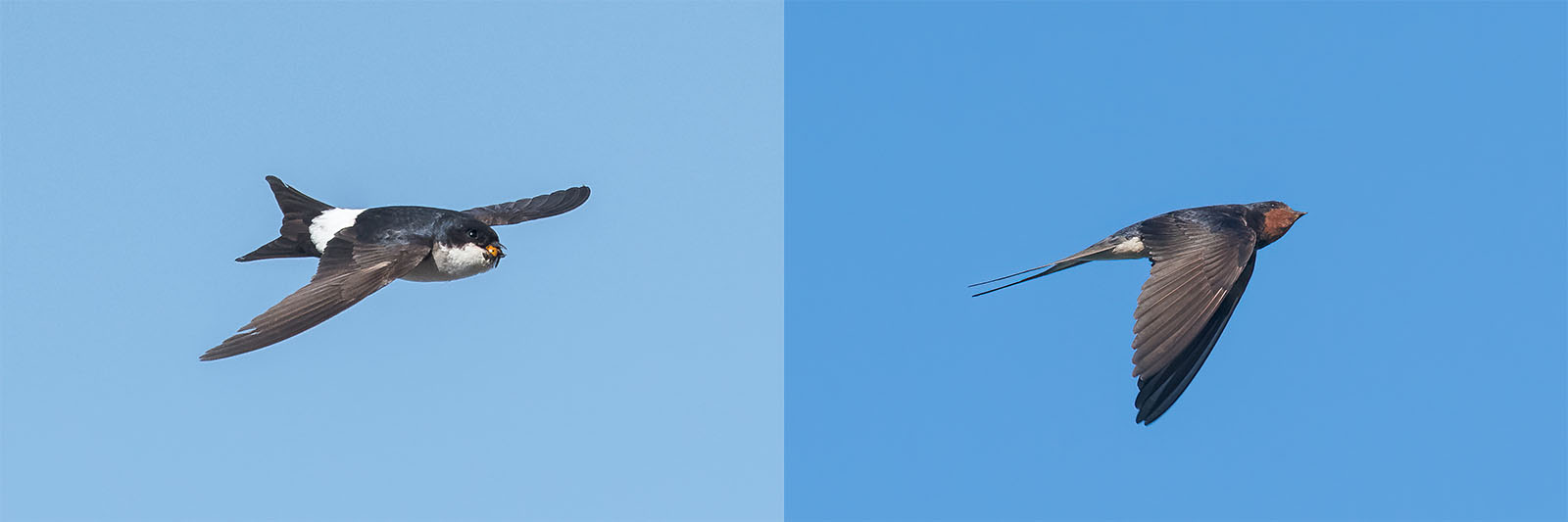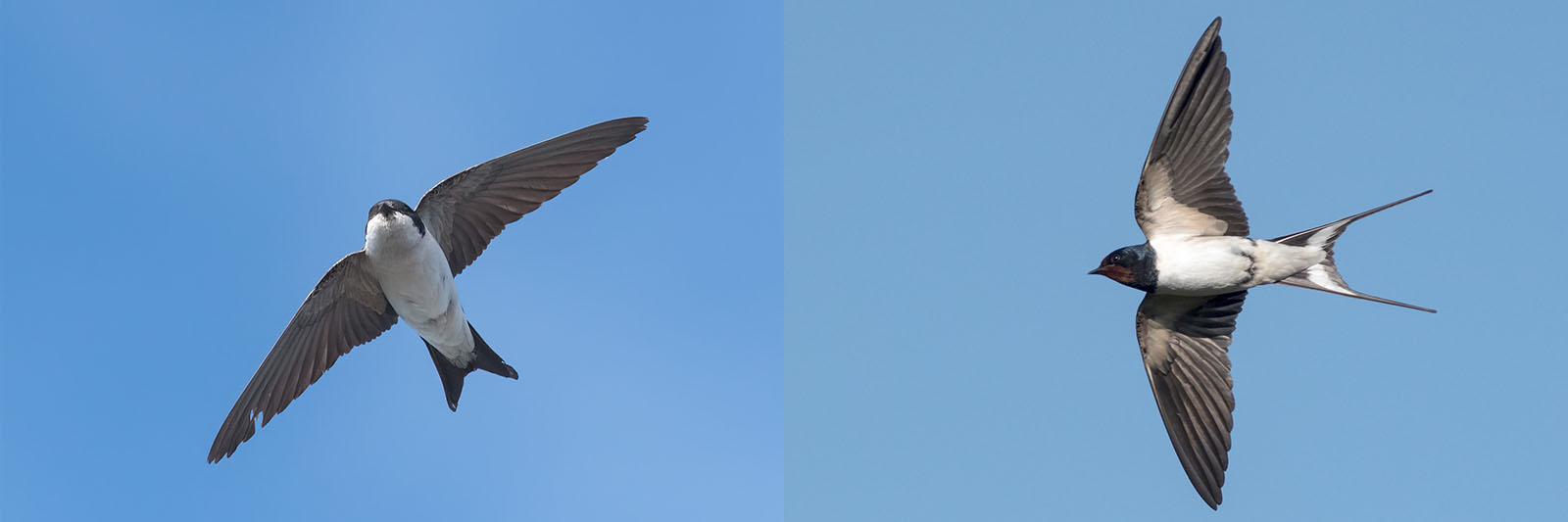 Lentävät räystäspääsky (vasen) ja haarapääsky alapuolelta. Kuvat: Mauri Leivo.