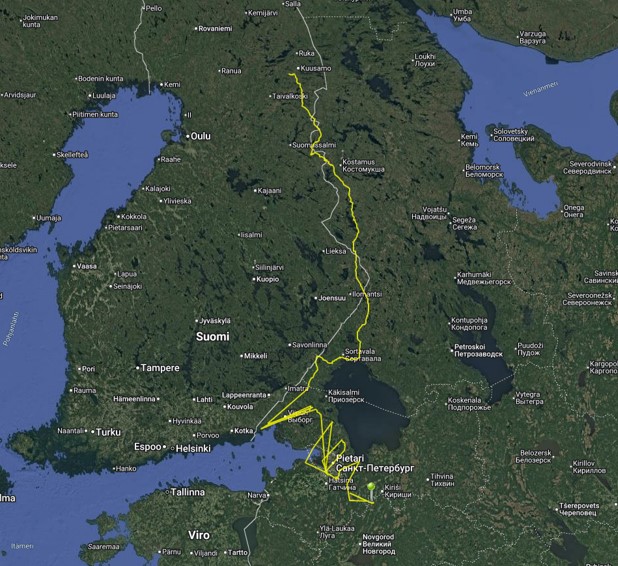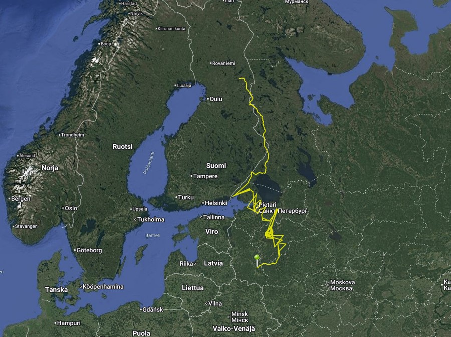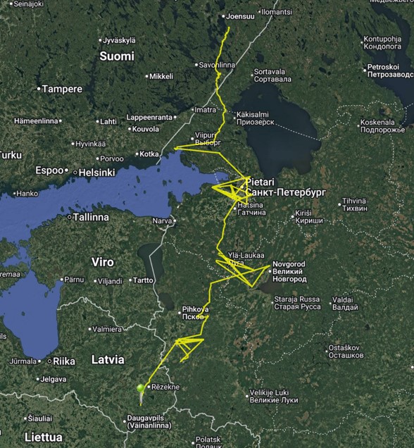 Novgorodin välitankkauksen jälkeen maakotka Oulan matka on jatkunut yhä etelämmäs. Nyt mennään jo Moskovan leveysasteilla, Valko-Venäjän rajalle on matkaa enää 200 kilometriä.