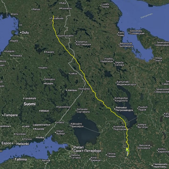 Satelliittimaakotka Kanerva on ehtinyt kevätmuutollaan jo lähelle synnyinseutujaan. Kanerva jätti Moskovan länsipuolella sijainneen talvehtimisalueensa 15.4. ja eteni parissa päivässä Laatokan kaakkoispuolelle, missä se viihtyi kahden viikon ajan. GPS-häirinnän vuoksi kovin tarkkaa kuvaa kotkan liikkeistä ei huhtikuun ajalta saatu. Matka kohti pohjoista jatkui vappuaattona Äänisen länsirantaa seuraten, ja 3.5. Kanerva oli päätynyt jo Suomussalmen korkeuksilla sijaitsevan Uhtuan lähistölle. Etäisyyttä synnyinpesälle on enää 160 kilometriä!