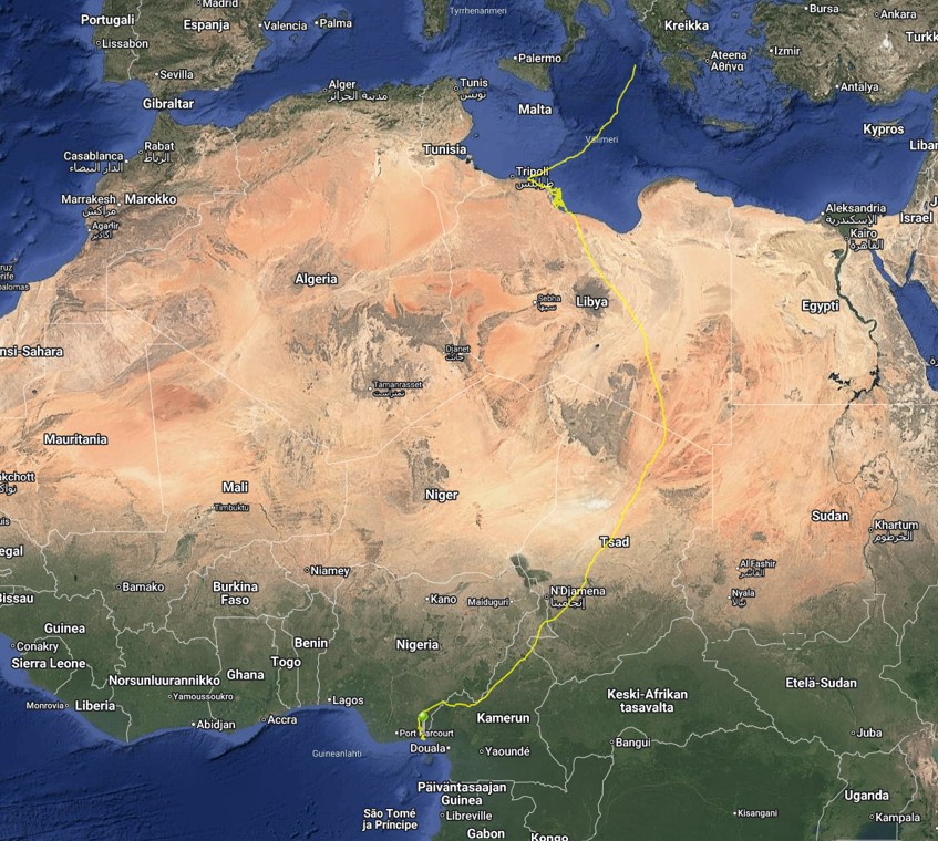 Satelliittiselkälokki Achillesin matka kohti lopullista (?) talvehtimisaluetta Nigerian ja Kamerunin rajoilla