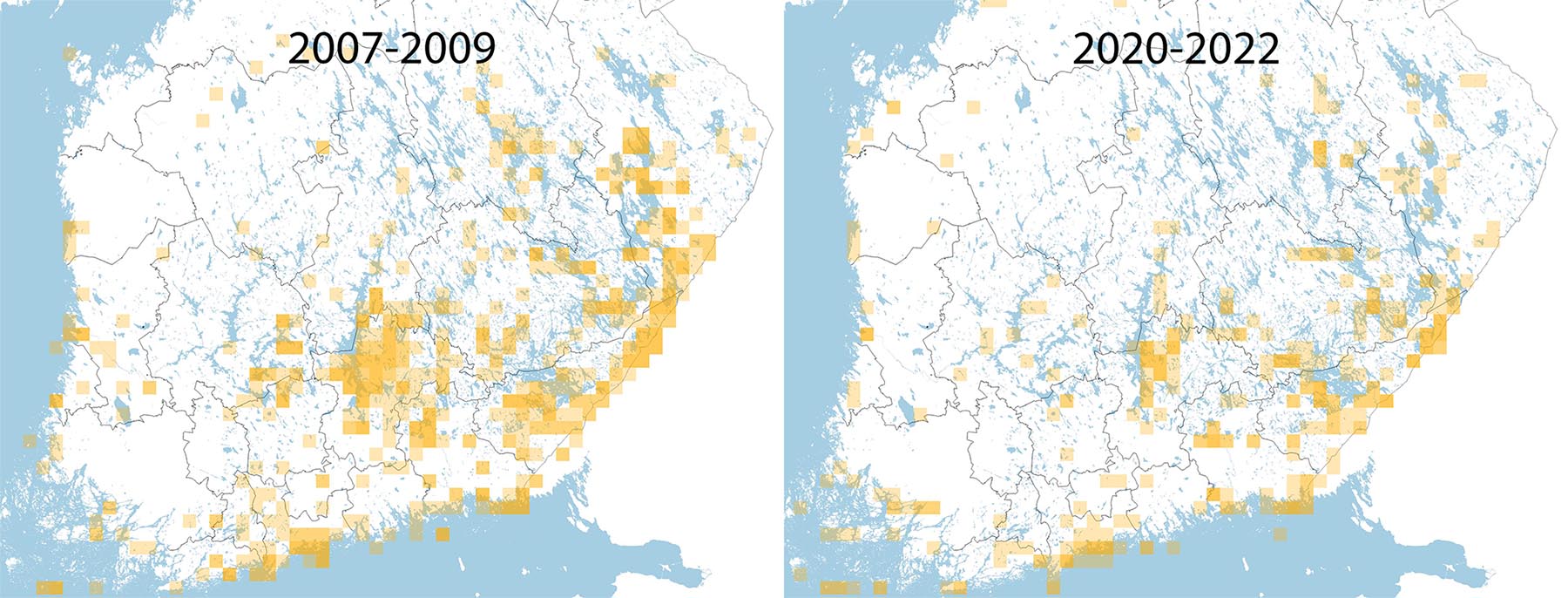 Tiira-lintutietopalvelun kuhankeittäjähavainnot vuosina 2007–2009 ja 2020–2022 sadan neliökilometrin ruutuina. Ruutu on sitä keltaisempi, mitä useampana vuonna ruudusta on tehty havainto kuhankeittäjästä. Lajin levinneisyysalue on supistunut huomattavasti reilussa vuosikymmenessä.