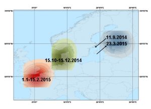 Uudellamaalla pesineen kaakkurin paikannukset talvella 2014/2015. Kartta: Ib Krag Petersen (Aarhusin yliopisto, Tanska).