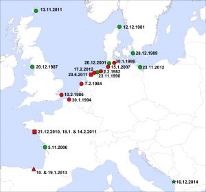 Winter-time ringing recoveries of the Finnish Red-throated Divers. Green dots = ring recoveries from 5th November to 28th December; red dots = ring recoveries from 15th January to 17th February; red squares & red triangle = photographed divers with darvic rings; green star = a diver drowned in fishing net in Montenegro.
