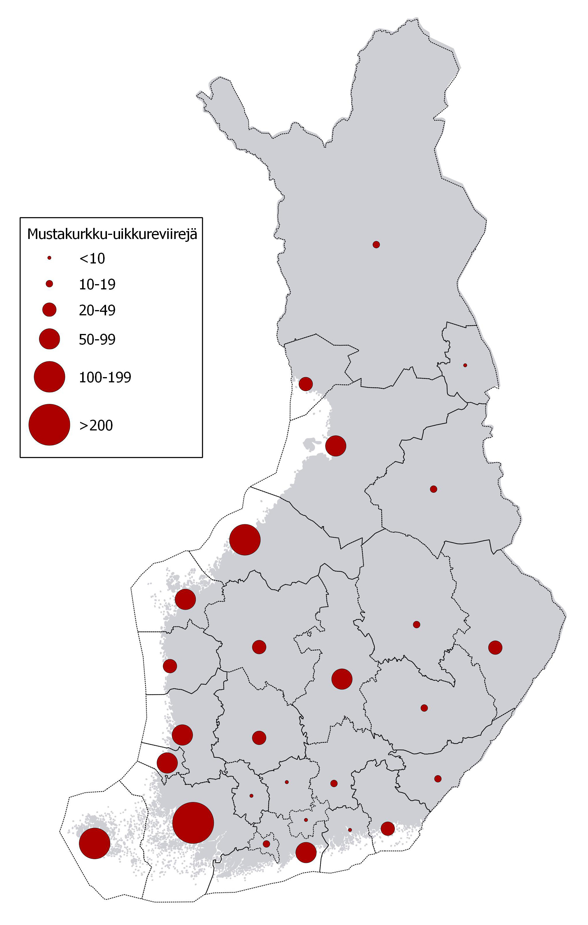 Mustakurkku-uikkuja havaittiin vuoden 2012 kartoituksissa 1 395 reviirillä. Yli puolet linnuista (712 reviiriä) asusteli merenlahdilla ja saaristossa. Sisämaan havaintojen jakauma on mielenkiintoinen: 40 prosenttia (268 paria) sisämaan mustakurkku-uikuista tavattiin erityyppisillä tekolammikoilla. Rehevillä järvillä ja järvenlahdilla pesi noin 27 prosenttia sisämaan linnuista, ja saman verran kannasta elää pienillä metsä- ja suorantaisilla lammilla. Avosoilta ilmoitettiin neljä prosenttia sisämaan reviireistä.