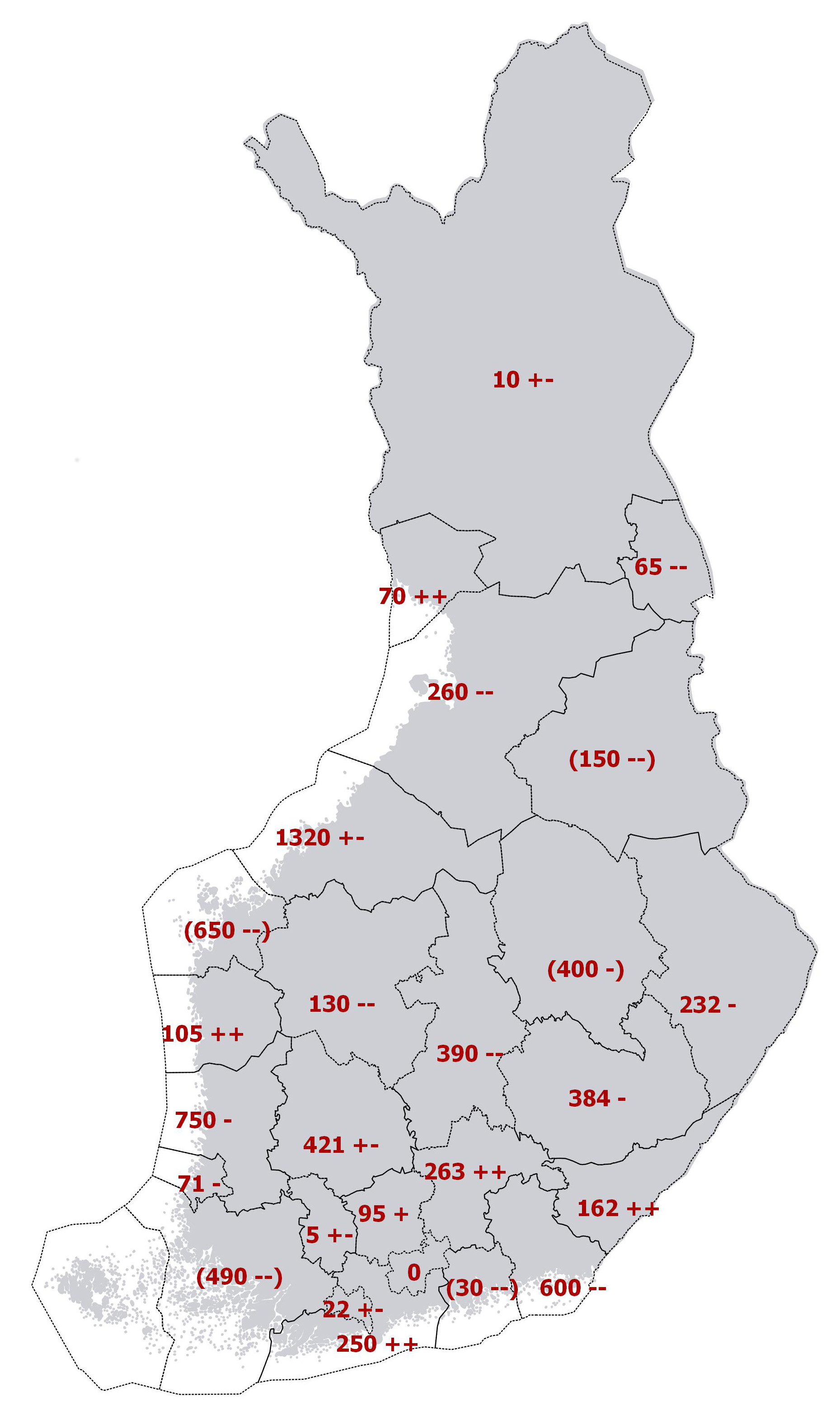 Selkälokin kannanarviot vuonna 2013 alueyhdistyksittäin. Vertailu vuoden 2003 tilanteeseen: +- = ei muutosta tai vähäinen muutos (15%).