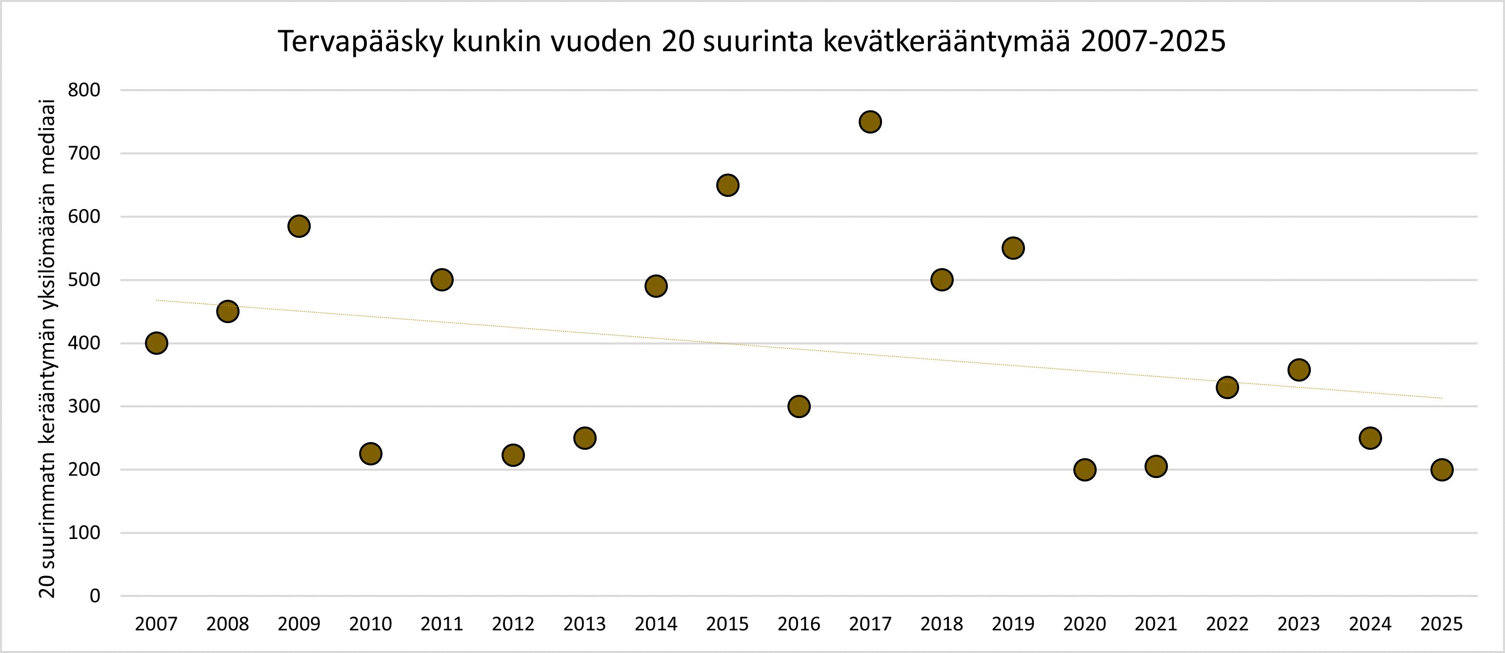 Havaintoaineisto antaa kuitenkin viitteitä siitä, että tervapääsky olisi viime vuosina vähentynyt, sillä kevätaikaiset kerääntymät ovat olleet viime vuosina hieman pienempiä kuin aiemmin, vaikka vaihtelu on suurta. Muutosta suurimmissa kevätkerääntymissä on tarkastelu kokoamalla aineistosta kultakin vuodelta 20 suurinta touko-kesäkuista kerääntymää.
