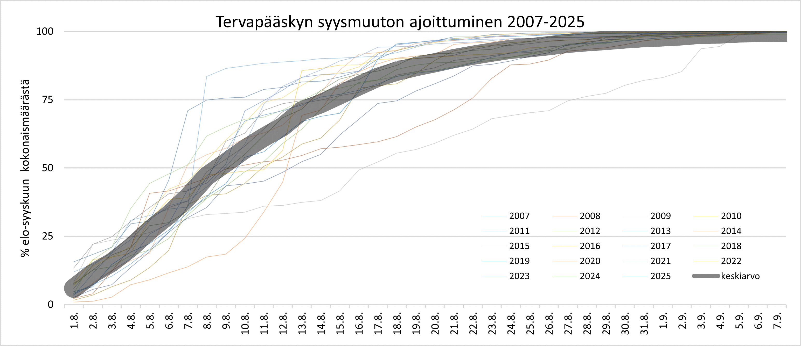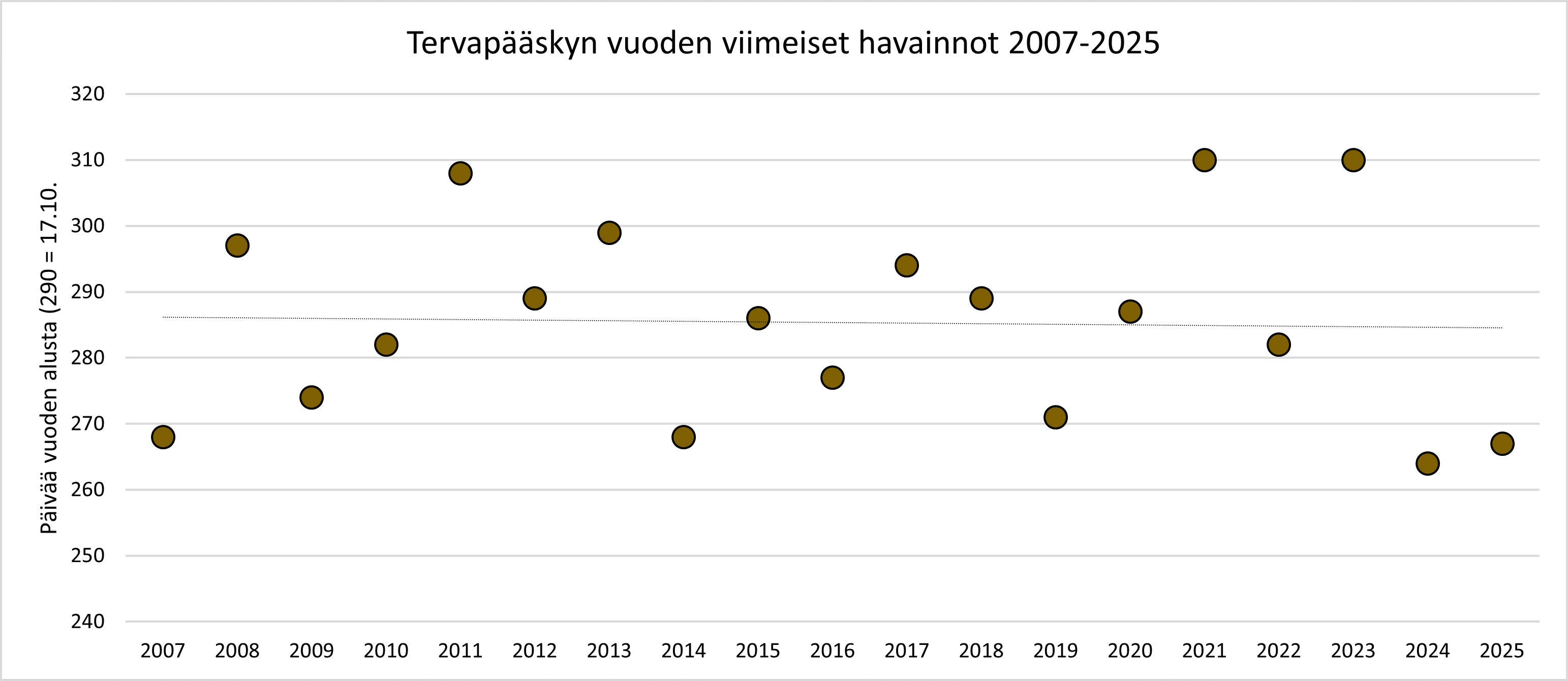 Tervapääskyn vuoden viimeisen havainnon havaintopäivässä ei ole havaittavissa trendiä, vaikka vuosien välillä on suuria eroja.