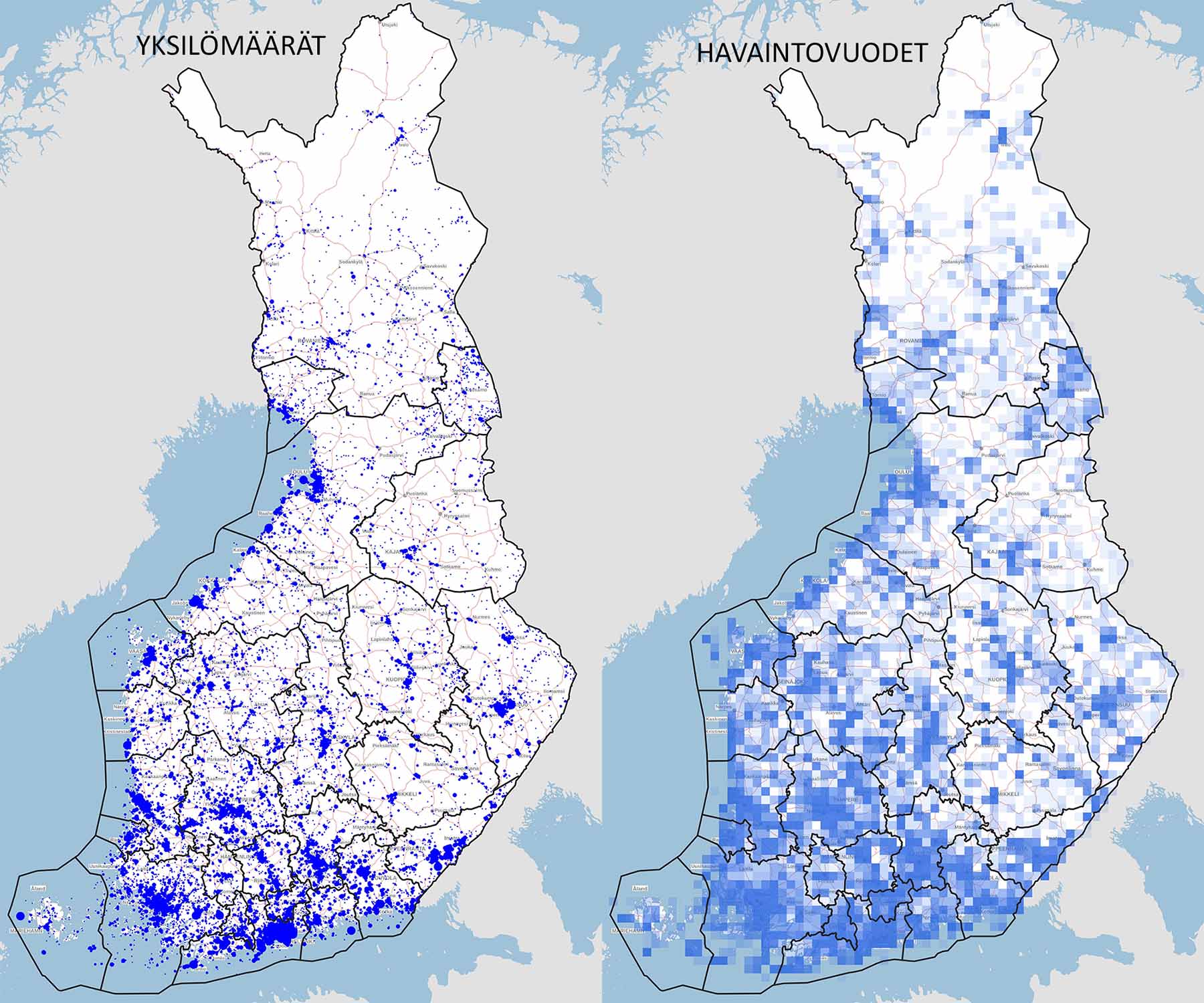 Tiiraan vuosilta 2007-2025 kirjatut tervapääskyhavainnot yksilömäärän mukaan (vasen). Havaintopiste on sitä suurempi, mitä suurempi on havainnon yksilömäärä. Oikealla on Tiiraan kirjatut havainnot 100 neliökilometrin ruuduittain. Ruutu on sitä sinisempi, mitä useampana vuonna ruudusta on kirjattu havainto tervapääskystä.