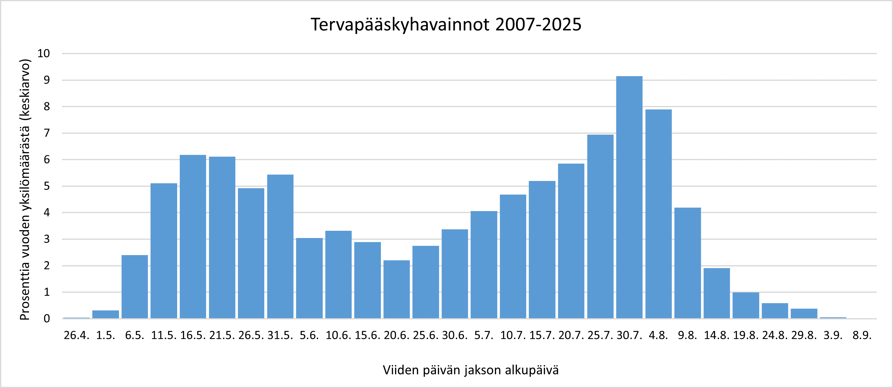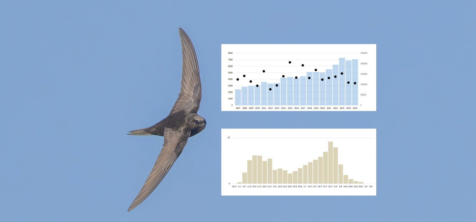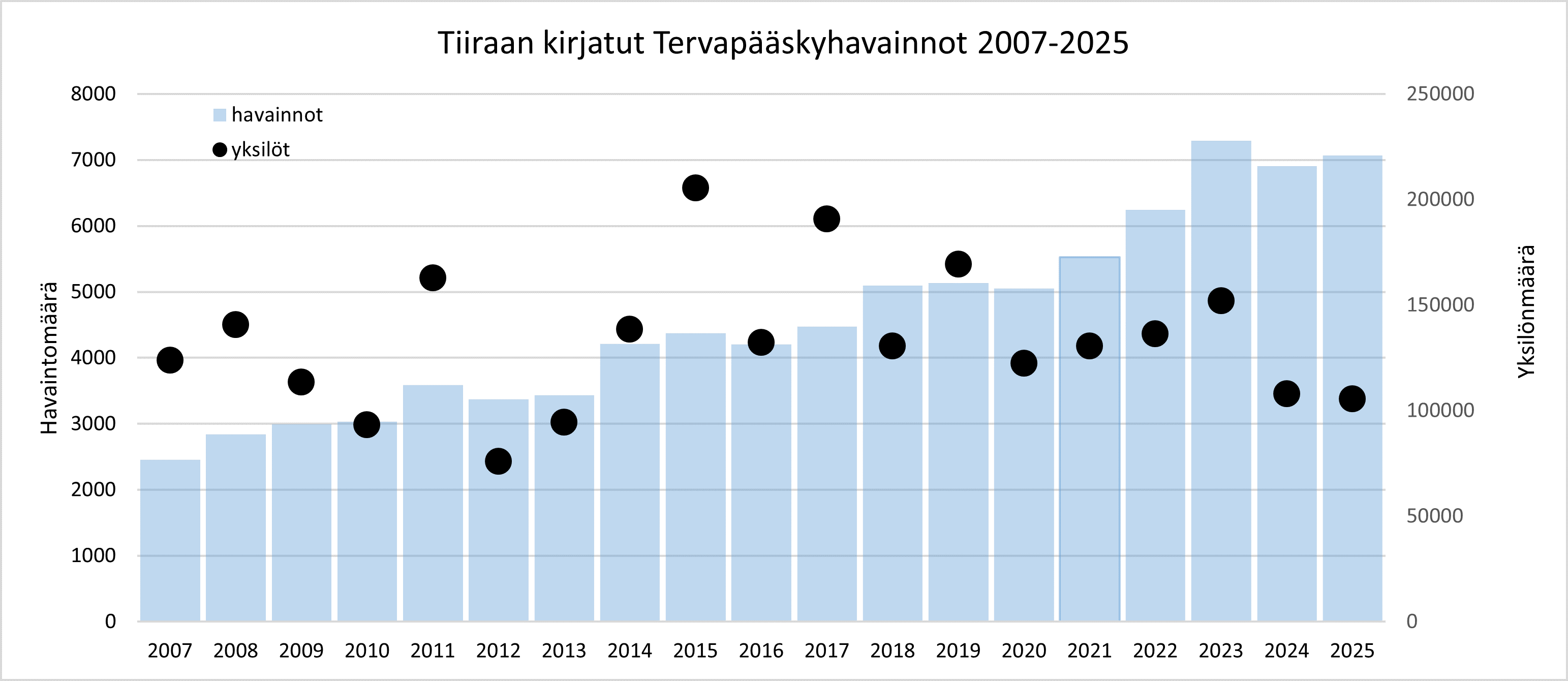 Vuoden 2025 loppuun mennessä Tiira-lintutietopalveluun oli kirjattu 112 437 havaintoa tervapääskystä. Havaintojen yksilömäärän summa on 3 637 617 yksilöä. Mitä havainnot kertovat tervapääskyistä Suomessa?