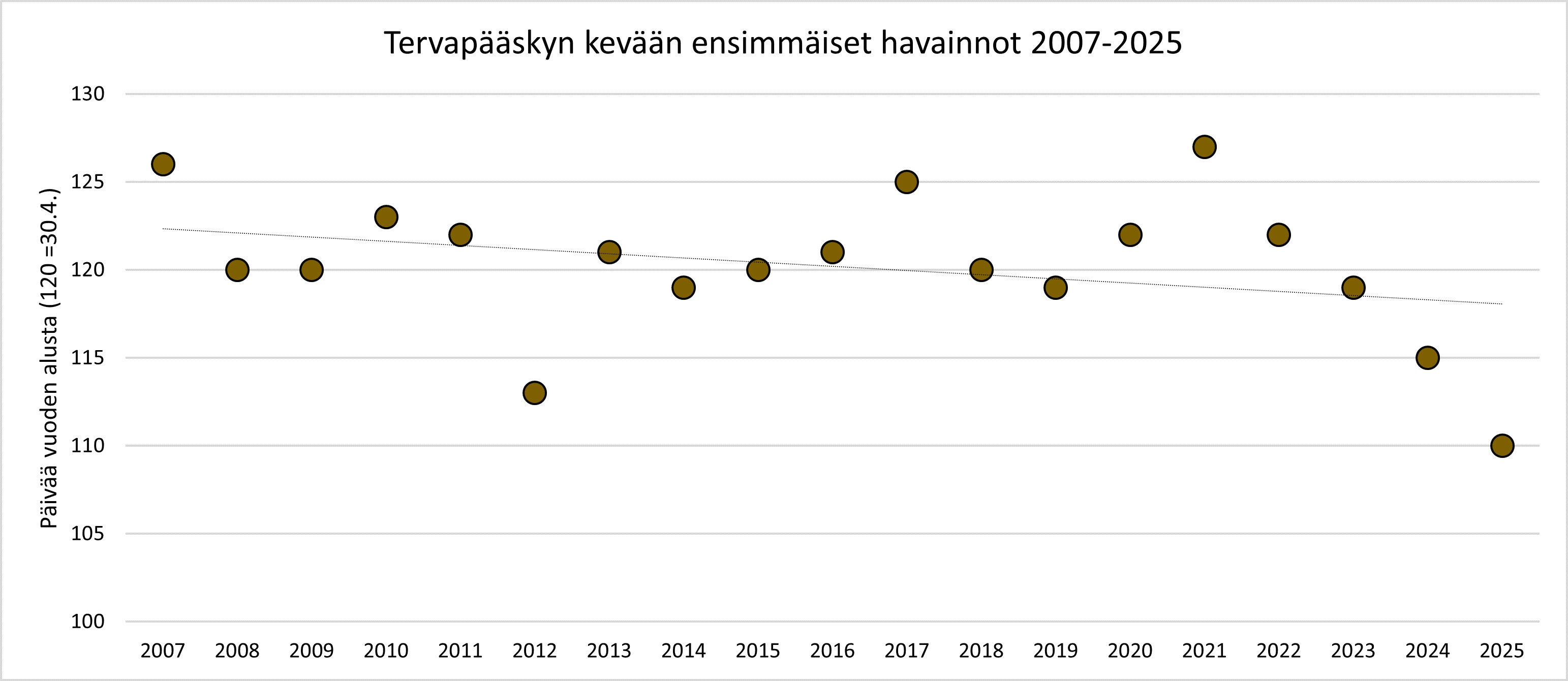 Tervapääskyn vuoden ensimmäisen havainnon (ensisaapuja) mediaani on 30.4. (vaihteluväli 20.4.-7.5., vuodet 2007-2025). Aikaisimmat keväthavainnot ovat: