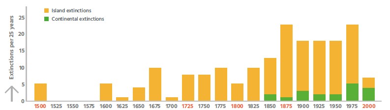 - Vieraslajit ovat yksi merkittävimmistä lintujen sukupuuttoihin johtaneista syistä: peräti 46 prosentin tunnetuista sukupuutoista arvioidaan johtuneen vieraslajeista. Erityisen suuren vaaran vieraslajit muodostavat valtamerten saarilla pesiville linnuille. Vieraslajit ovat silti haitta kaikissa elinympäristöissä: esimerkiksi kissojen on arvioitu tappavan Kiinassa ja Yhdysvalloissa vuosittain miljardeja lintuja.