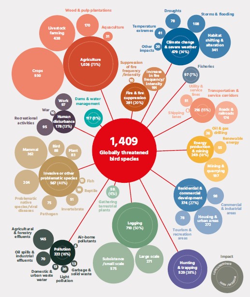 - Suurin yksittäinen lintukantoihin vaikuttava tekijä on maatalous, joka on uhanalaisista lajeista lähes kolmen neljäsosan taantumisen taustalla. Korkean elintason maissa tuotannon tehostuminen heikentää maatalousympäristön lintujen elinmahdollisuuksia, kehittyvissä maissa ensisijainen uhka on muiden elinympäristöjen kuten metsien raivaus maatalous- ja laidunmaaksi.