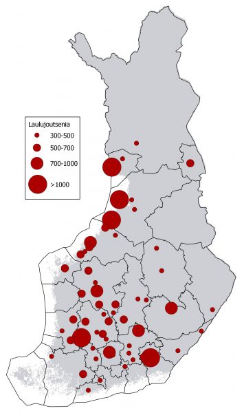 ![]() Laulujoutsenten määrät kunnittain (yli 300 joutsenen kunnat). |