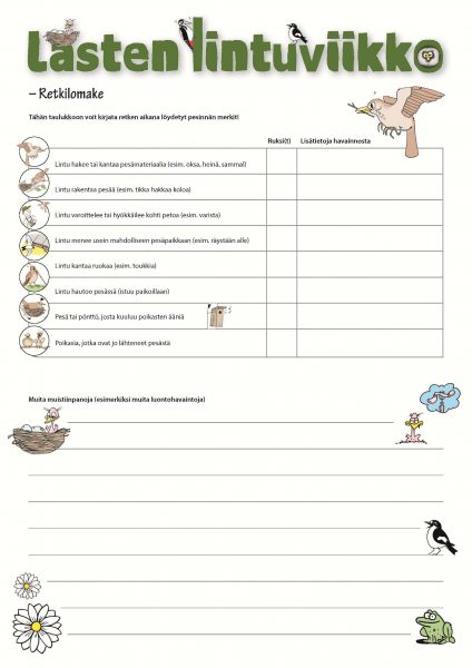 Retkilomakkeelle voi ruksia havaitut pesinnän merkit! Tulosta bingo- tai listamuotoinen lomake pdf-tiedostosta (ks. linkit ohessa).