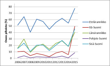 Pihlajanmarjojen runsaus näkyi myös räkättirastaan ja taviokuurnan huippuesiintymisenä. Erityisen paljon marjalintuja nähtiin Oulun seudulta Pohjois-Karjalaan ulottuvalla vyöhykkeellä, kun taas Suomen eteläisimmissä maakunnissa ei esimerkiksi taviokuurnaa tavattu lainkaan.
