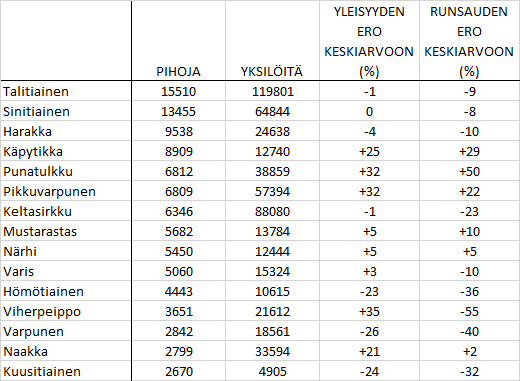 | Talitiainen | Itä-Suomi | 24758 | 8,85 | -1 | -5 | -1 |