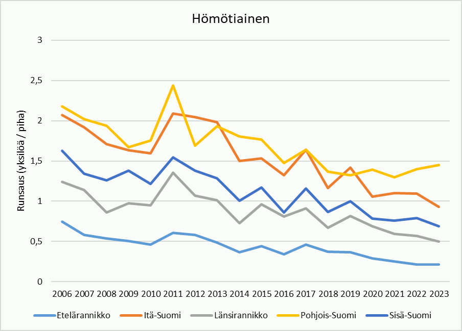 | LAJI | ALUE | YKSILÖITÄ | YKSILÖITÄ/PIHA | ERO VUOTEEN 2022 (%) | ERO KESKIARVOON 2006–2022 (%) | KANNANMUUTOS (%) |