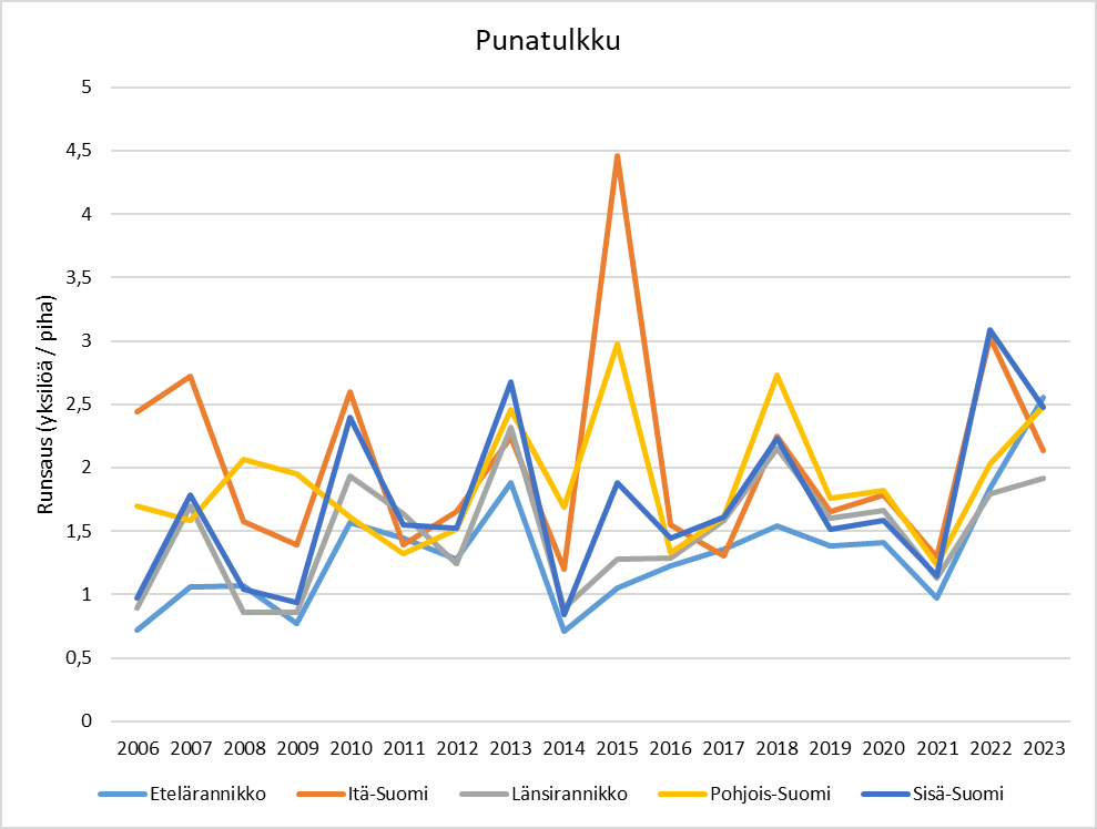 Punatulkku on osittaismuuttaja, jonka talvinen runsaus Suomessa vaihtelee suuresti ravintotilanteen mukaan. Vuoden 2023 runsaus on yllättävä marja- ja siemensadon kehnouteen nähden. Talvista punatulkkukantaa voivat vahvistaa myös vaellukset hyvien pesimäkesien jälkeen. Kuvassa on esitetty lajin runsauden (yksilöä / piha) vaihtelu eri osissa Suomea vuosina 2006–2023.